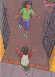 In the beginning of the story, we see how thrilled and excited José is to finally be getting to visit his mamá. Then we are taken down memory lane into what life was like before Mamá was taken away from them. As they are driving south to Tijuana, René writes about places Mamá has gone to in her life in San Diego, the school where she studied english, her favorite bakery to get her favorite pan dulce. These descriptions, along with the bright and vivid illustrations, bring the characters to life for the reader. Just like them, the characters are living normal lives, going to school and eating their favorite treats. This portrays a family of the latinx culture and background in a positive and relatable light. The illustrations act as reinforcement to the story being told. The illustrations are bright, vivid, and lively. Each picture invites you into the story and the lives of the characters. Readers could look through this book and discuss the various emotions of the characters at any point in the story. I think the bright colors used are also very representative to the art of Mexico.